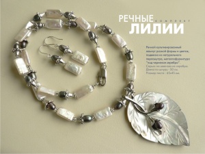 Жемчужный контрастный комплект "Речные лилии". Речной культивированный жемчуг разной формы и размеров, подвеска из натурального перламутра, металлофурнитура под черненое серебро, ювелирный тросик. Серьги на серебряных швензах. Длина по шнуру - 50 см. Размер подвески - 65х45 мм. 1350 руб.