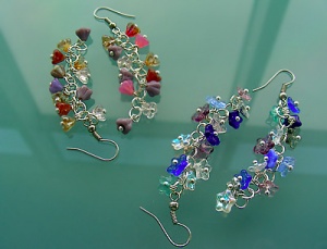 Стекло граненое и гладкое, металлофурнитура. Основа - мемори-проволока, держит форму круга. Швензы серег - посеребренная медсталь.