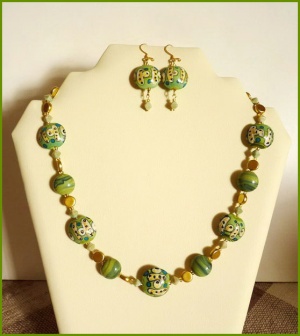 Кулон и серьги - бусины ручной работы, натуральный жемчуг, стекло, кристаллы Сваровски, бисер, посеребренная и металлическая фурнитура. Длина колье - 44 см.