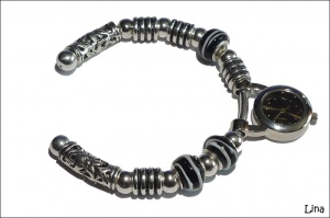 Вместо часов можно поставить бусины. Основа браслета позволяет самостоятельно менять бусины (откручиваются наконечники). Размер: на запястье от 16 до 20 см (кто-то любит посвободнее, кто-то поплотнее), но вообще надо мерить. К сведению: такая же основа для браслета у меня есть маленького размера, на тонкое запястье.