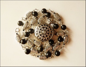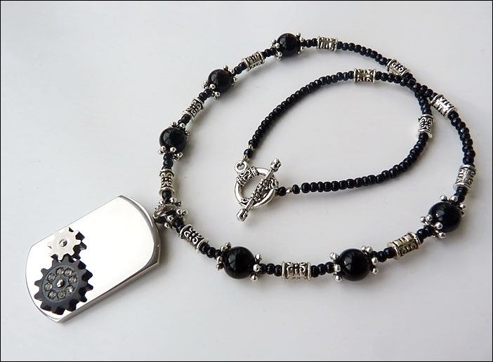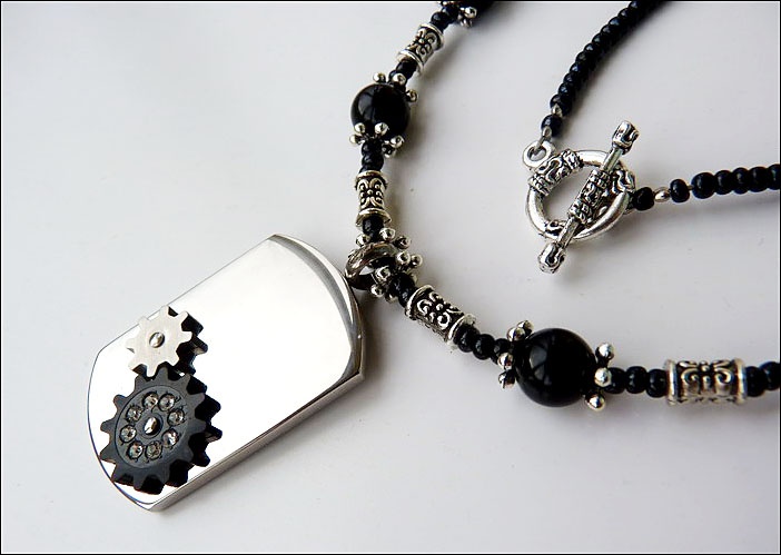 Кулон из высококачественной стали, заполированной до зеркального блеска, бусины из черного агата, бисер, металлофурнитура под черненое серебро.