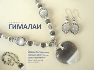 Комплект в мягких серых тонах "Гималаи". Дымчатый индийский агат с друзой кварца, кошачий глаз, перламутр, металлофурнитура, ювелирный тросик. Серьги на серебре. Размер агата — 40х35 мм. Длина кулона по шнуру — 50 см. 1150 руб.