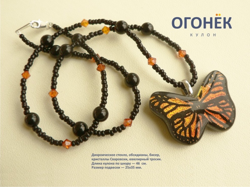 Легкий кулон с рыженькой бабочкой из дихростекла. Таких вещей здорово не хватает как раз в последние предзимние ноябрьские дни... когда вокруг пасмурно, холодно и сыро и ощущается дефицит ярких красок:-) В зависимости от угла падения света бабочка переливается оттенками от желто-зеленого до огненно-рыжего. Дихроическое стекло, обсидианы, бисер, кристаллы Сваровски, ювелирный тросик. Длина кулона по шнуру — 46 см. Размер подвески — 25х35 мм. 850 руб.