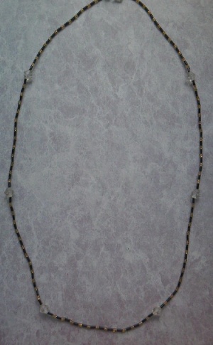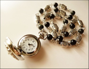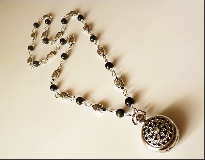 Кулон-часы (кварц; диаметр 3 см, крышка корпуса оформлена эмалью и стразом) на цепи из бусин обсидиана и металлических бусин под черненое серебро.