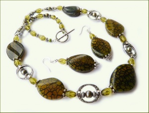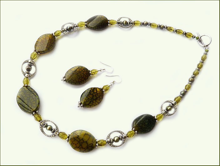 Агат "вены дракона", натуральный тонированный жемчуг, стекло, фурнитура под черненое серебро, посеребренные швензы серег. Длина колье 50 см, длина серег от швензы 4 см.