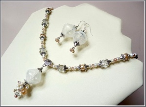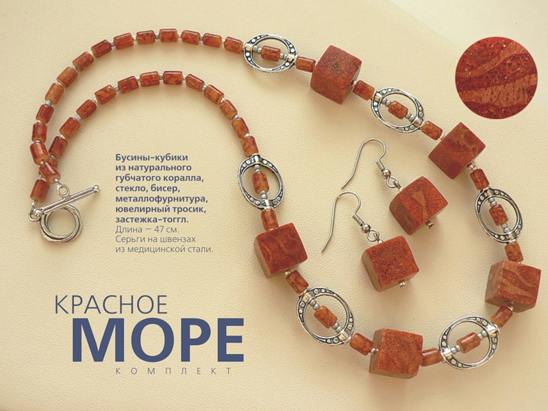 Лэмпворк (Чехия), прессованный коралл, кристаллы Сваровски, стекло, бижутерная и позолоченная металлофурнитура. Центральная бусина - полая. Швензы серег - позолоченное серебро. Длина колье 43 см + удлиняющая цепочка 7 см.