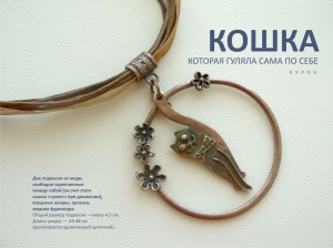 Лаконичный изящный кулончик из двух медных подвесок, свободно скрепленных между собой, - за счет этого кошка "гуляет" при движении.