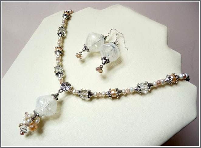 Полые бусины ручной работы, жемчуг трех цветов и двух размеров, граненое стекло, кристаллы Сваровски цветов Golden Shadow и Silk, металлофурнитура. Швензы серег - серебро. Длина колье 34 см, длина подвески 5 см.