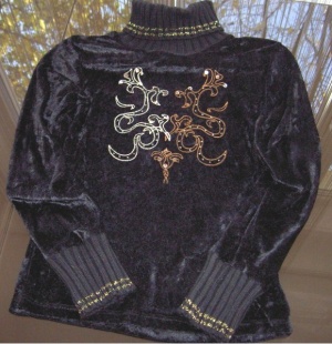 Материал очень качественный стрейч. На ткани выполнен узор иммитирующий вышивку.