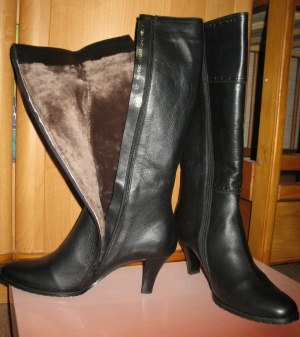 Натуральная кожа, натуральный мех. Высота каблука 7 см., обхват голенища в самом широком месте - 19 см., в самом узком - 12,5 см. Подойдут на ногу средней полноты в ступне (размер переходный 39-40) и довольно широкую в голени.