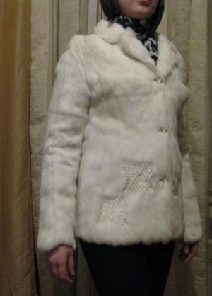 Продается шубка из белого кролика, р-р 42-44. Длина по спинке 70 см. Воротник классический. спереди нашивки из страз. Носилась 3 года. потом лежала. Куплена в Истнове задорого, отдам за 1500!!!