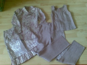 Продам праздничные вещи - два костюма и платье. Все примерно одного размера, максимум на 42-й (точного размера не знаю, т.к. вещи шились на заказ). Мне стали малы, носила очень мало, платье и коричневый костюм раза по два, розовый - раз 5, наверное. Максимальные размеры, думаю, должны быть 82-65-87, или около того. По ценам: за платье и коричневый костюм (юбка с кофтой) по 700 руб., за розовый костюм-четверку - 1000 руб.