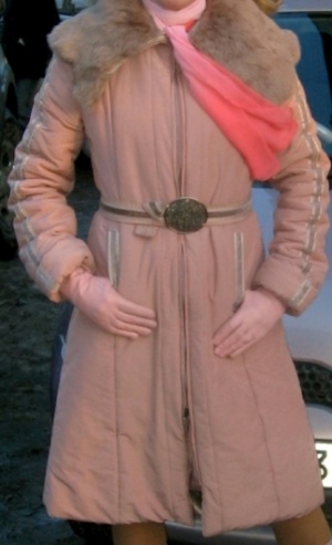 Пальто утепленное на синтепоне на молнии. Очень теплое, до -15 отлично. Рост до 180 - манжеты закатываются. На рост 170 колени закрывает полностью (на фото). Размер 44, возможно на 46. Цвет пудры, в реале глуховатый, ткань с небольшим блеском.