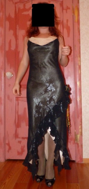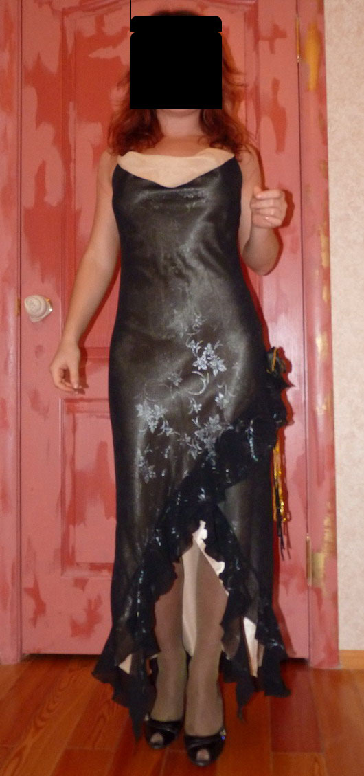 2. вечернее двухслойное платье. Сбоку оформлено красивым принтом-цветком. На фото девушка ростом 160 см + каблук, но вполне подойдет и на более высоких. На груди "ворот" можно как наружу сделать. так и внутрь. р.42-44. - 1000 руб.
