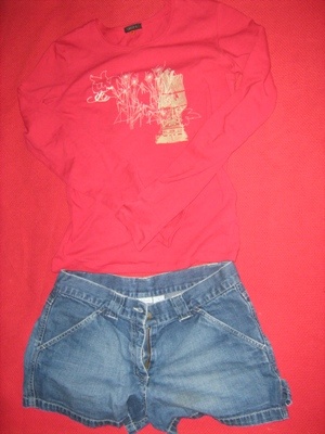 4. шорты на размер 42-44 (100р) и красная кофтчка Инсити, размер 44 (100р) - на фото фон тоже красный, поэтому только угадывается