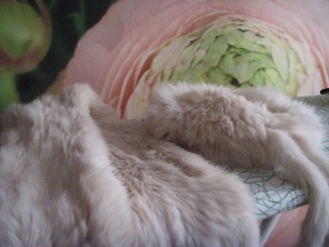 2.Зимняя шапочка(на резинке) и шарф из шиншиллы и кролика, цвет жемчужный. 1500р.