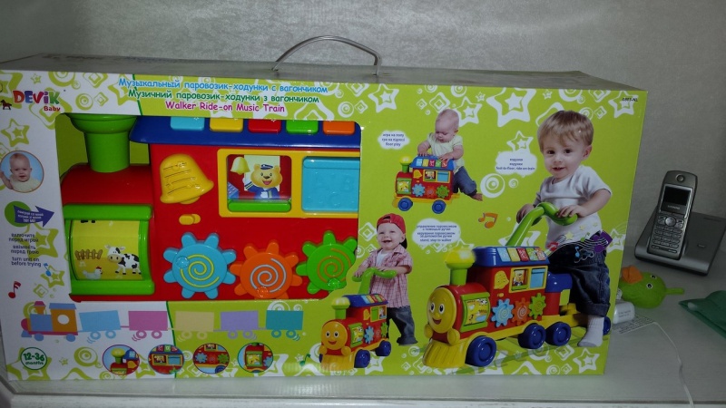 у нас вот такая есть , можно идти и толкать, но шарики никакие не вылетают, всякие звуки паровоз излаёт при этом, у нас Демиду 7 мес. так он уже с ней играет постоянно, не оттащишь, но он пока только всякие кнопочки-крутилки нажимает...а вообще на игрухе написано с 12 до 36 мес. Это типа игровой центр-ходунки. но и как толокар может использоваться прицеп.