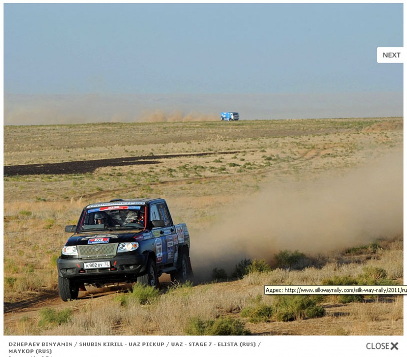 Покопался в фотках на сайте ралли "Шелковый путь 2011". Всесторонне представлены L200. WV. uhepjdbrb и др. В числе "др" обнаружилась единственная фотка Патриота-пикапа.с неизменным Б.Джепаевым за рулем..