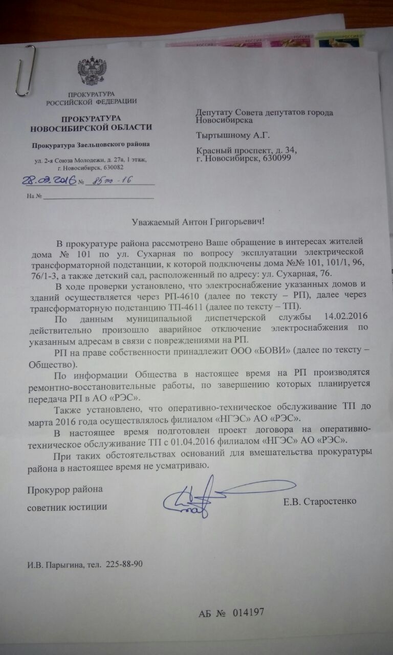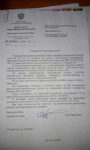 пришел ответ из Прокуратуры по поводу рабочей подстанции 4610,