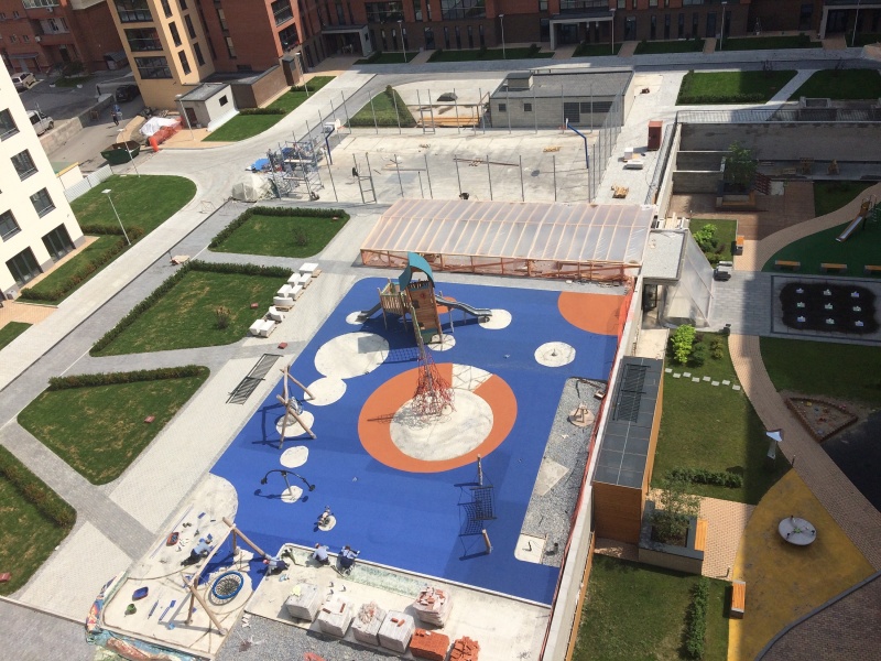 Сан Саныч - учитывая, что покрытие за два дня положили, то дай Бог каждому таких подрядчиков.На спортивной площадке покрытия пока нет, это бетон. По цвету ограждения ничего сказать не могу, наверно серый цвет не отвлекает от игры. Резиновое покрытие покрытие будет цветным, но наверное не ярким, а практичным.