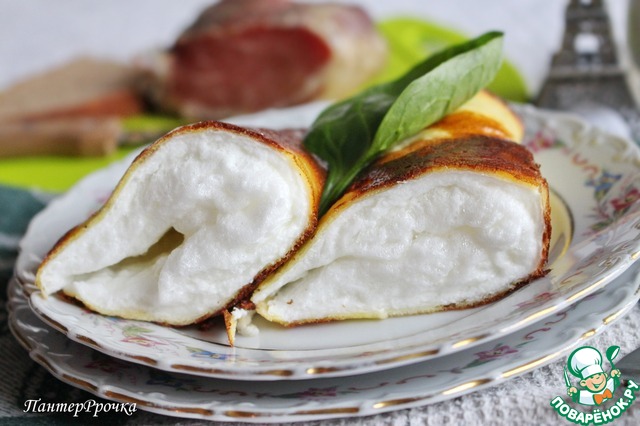 Не то, чтобы фирменный, но несколько раз готовила: делаете несколько простых омлетиков-лепешечек, потом складываете, как коржи торта один на другой, переслаиваете теми начинками, какие вам больше нравятся. Я делала так: один слой - резаные овощи (помидорки, перчик болгарский, огурцы), второй - фарш обжаренный с грибами (у меня от другого блюда оставался, вот и использовала, можно и специально обжарить), третий слой - мелко порезанная зелень, смешанная с творогом и сметаной. Сверху полила сметаной, посыпала рубленым грецким орехом, убрала на несколько минут в духовку.