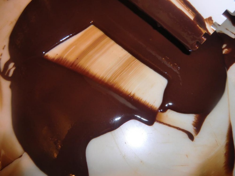 Опять же с темперированием я маху дала. Понадеялась на новый, специально купленный для таких дел, термометр. А он, зараза, как и все электронное, глючит. Когда нагревала, остановился на 30 С, по факту-то я чувствую, что гораздо больше, быстро сняла с бани чашку, термометр выключила, помыла, снова включила, а шоколад-то у меня уже 50 С. И нагревается он медленно, надо на пару градусов до нужной температуры снимать.
