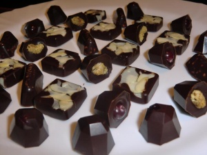 далее чернослив и курагу окунаем в шоколад и выкладываем на силик.коврик для застывания, фаршированные финики я закладывала в формы........шоколада делала опять 500гр, конфет вышло 1.2кг