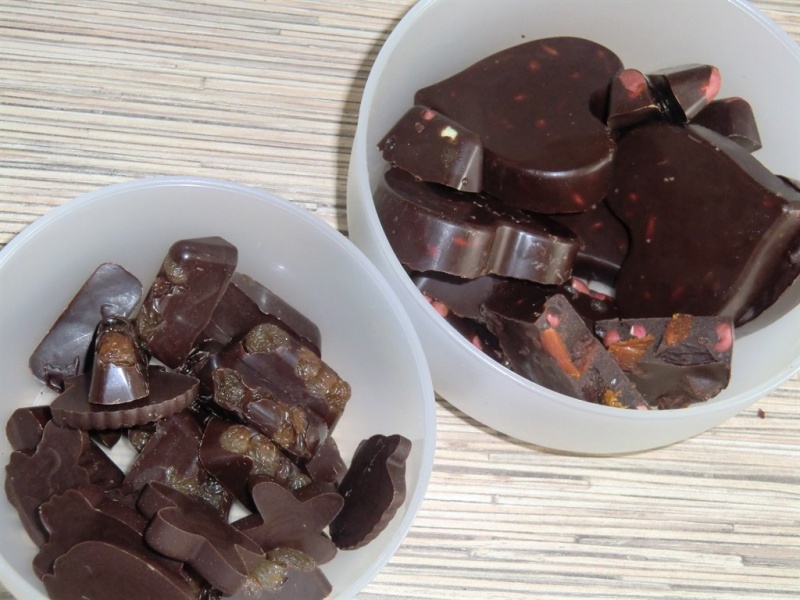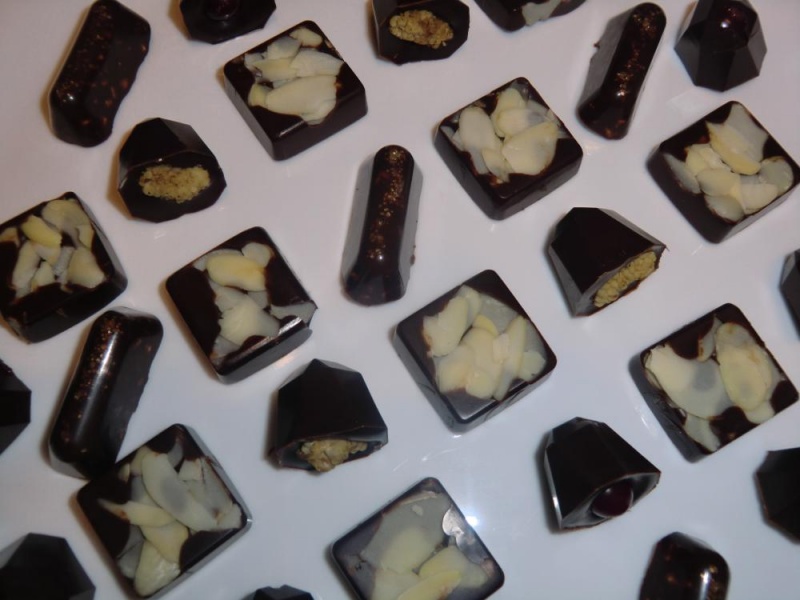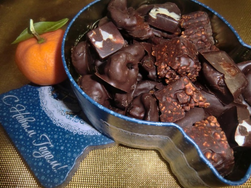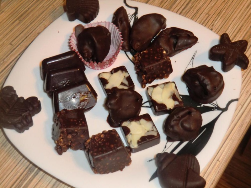 делала конфеты 70%какао, делала в подарок знакомой, и на кануне вручения, поэтому что дома было-то и положила, голову греть не стала, наполнители- тутовник, клюква, миндальные лепестки, воздушный рис.....хотя есть желание и корпусные конфеты попробовать....