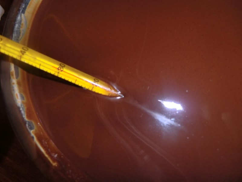 температуру я измеряю водным термометром-точнее аквариумным(новым конечно), есть такие желтенькие длинные трубочки с делениями до 50градусов и запасом подъема примерно еще на 10градусов, когда первая часть вся растает-измеряю, добавила сгущенку-еще раз, остыло до 50гр, тогда начинаю темперирование, отлила 2/3 на мрамор а термометр остался лежать в миске с 1/3-ю......подумала что только для шоколада элетронный термометр мне не нужен, а больше необходимости в нем пока не возникало