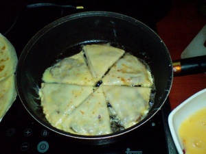 Затем в отдельной тарелке разбиваем яйца - у меня получилось три и просто взбалтываем их. Каждый блинчик обмакиваем в яйце со всех сторон и обжариваем. Я жарила на сливочном масле - мне так показалось вкуснее. Кстати, если кто боится, что фарш внутри не прожарится - я жарила на несильном огне (примерно на каком вы готовите омлет) - все отлично прожарилось.