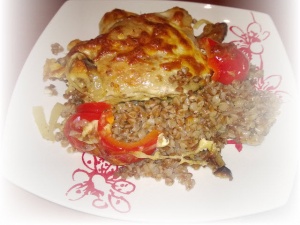 На дно жаропрочной посуды чуть растительного масла, промытой гречки, посолить, добавить воды 1 к 1.5 и сверху сложить курицу. В духовку на 200 градусов на полчаса. Затем перевернуть, намазать сметаной, посыпать тертым сыром и еще минут на 15. Я на втором этапе добавила крупно порезанный болгарский перец, который получился al dente.