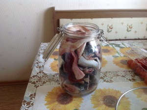 Сварила голову (жабры убрала), хвост и позвоночники и шкуру с обрезками брюшка (одним словом всякую чешую...пришлось переступить через себя вообще то ибо не так просто сознавать что варишь отходы