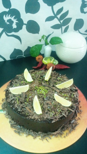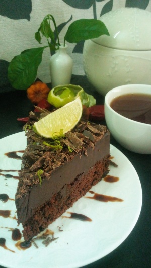 При кажущейся сложности,пирог прост в изготовлении,бисквит не представляет сложности,просто все перемешать,а ганаш вообще трудно испортить.В оригинальном рецепте была еще корица,но я ее не очень люблю,при желании можно добавить.Думаю также,что вместо лайма можно взять апельсин.