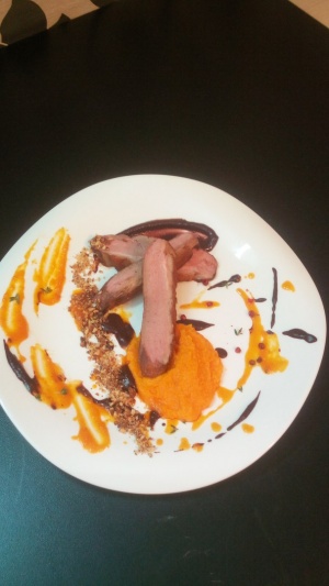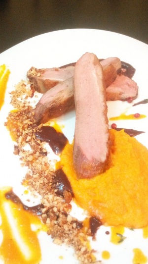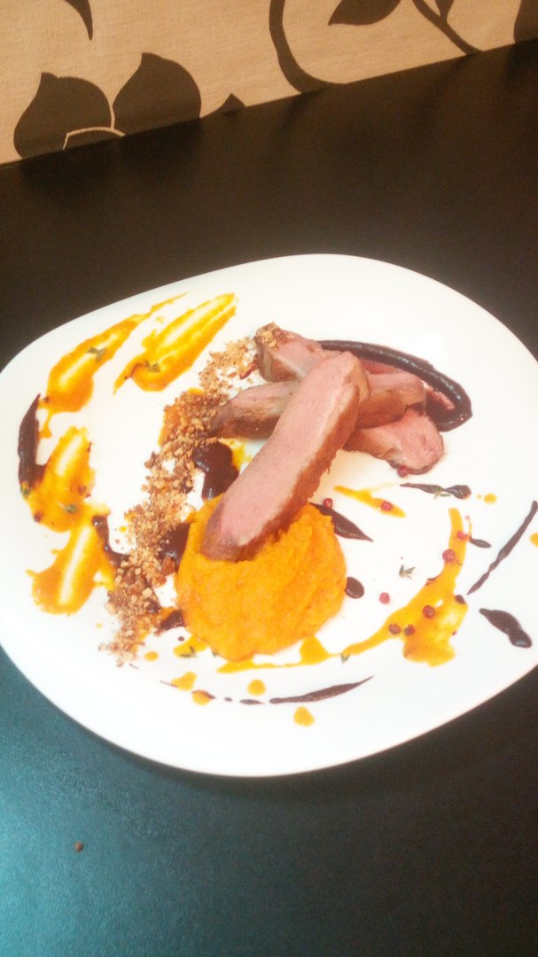 Выложить мусс,разбрызгать соусы.Грудку разрезать вдоль на три части,уложить на блюдо,сделать декор из крамбла.