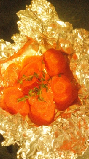 Морковь нарезать шайбами 1 см,сбрызнуть маслом,завернуть в фольгу и запечь при 150 гр.примерно минут 40,в конце добавить веточку тимьяна для аромата.Еще теплым протереть через сито или перемолоть блендером,ввести сливочное масло и лимонный сок.