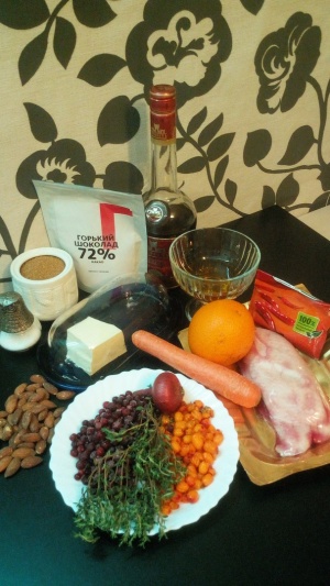 Лук притушить в слив.масле,всыпать сахур,влить коньяк,дать выкипеть,всыпать бруснику ,соль и шоколад,проварить до загустения,протереть через сито.