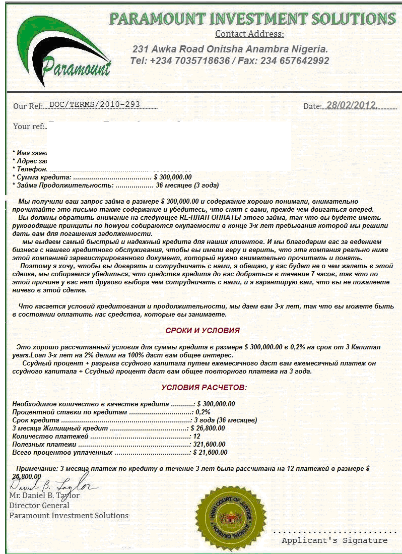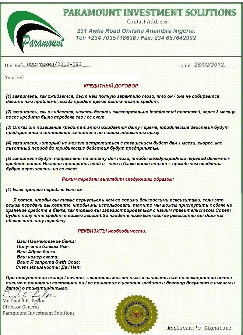 несмотря на ужасный перевод поняли, что кредит одобрен, были приложены два документа. Чувствую, что где подвох. Вопрос где? Почему вдруг компания так легко соглашается на выдачу кредита непонятно кому, на другом континенте, не интересуясь ни платежеспособностью, ни поручительством, ни залогом. Есть только одно предположение, что после пересылки денег за проверку счета компания исчезнет с нашего горизонта.