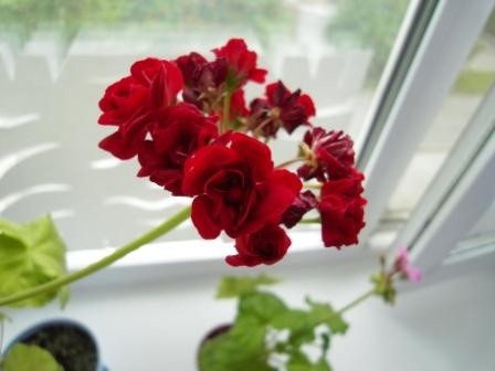 Отдам 2 взрослых герани (цветет маленькими красными розочками - махровая