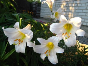 Есть вот такая лилия. Предлагаю по 50 рублей (но не штука , а гнездо: к одной цветущей присоединена куча прикорневых более мелких луковиц и деток). Высота лилий около 50 см, на цветоносе 1-2 цветка бывает, цветет в июле. Запах дурманящий. Относится к группе трубчатых. Вроде сорт РЕГАЛЕ, но не уверена