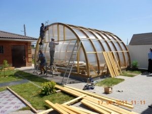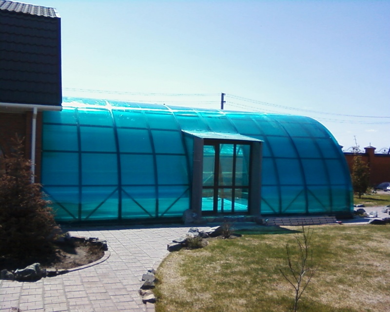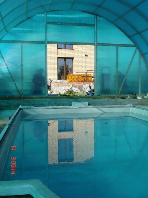 А вот фото, которые я обещал. Пока установлен только внутренний слой поликарбоната, доделать обещали в понедельник. Потом останется установить пластиковый витраж с входной дверью главного фасада и форточную группу с другой стороны. Вот это укрытие реально позволит эксплуатировать бассейн даже зимой! Репортаж с места событий постараюсь продолжить.