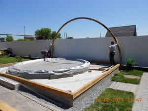 Согласен с Вами, я тоже встречал закрытый бассеин обычным деревянным каркасом(такойже как на теплицах) отличие в том что он установлен на фундамент, ну и соответственно с запасом вдоль длины и от одного торца примерно 1,5-2м , от второго торца отступили метра 4,5 где разместили зону отдыха.