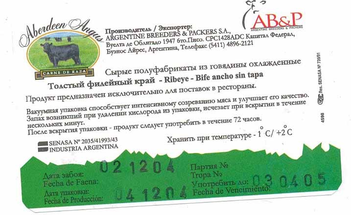 Да, был еще вопрос о природе самого мяса - Ангус не Ангус. Прицеплю этикетку от упаковки с этим мясом, прошу обращать внимание на верхний левый угол.