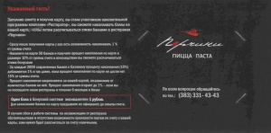 Вопрос к Перчини: Здравствуйте! 18.10 были в Перчини ( Аура), брали заказ по бизнес -ланчу на 532 руб, к сожалению на карту накопилось только 5 руб.32 коп, вместо 52 рублей. Картой пользуемся уже года два и неоднократно снимали накопления ( по 500-800 руб) до 0 р. Вот и этот раз карта была обнулена и нам не смогли корректно зачислить сумму бонуса. Администратор сказала звонить в отдел маркетинка ( но туда я безрезультатно звоню уже третий день-постоянно занято).