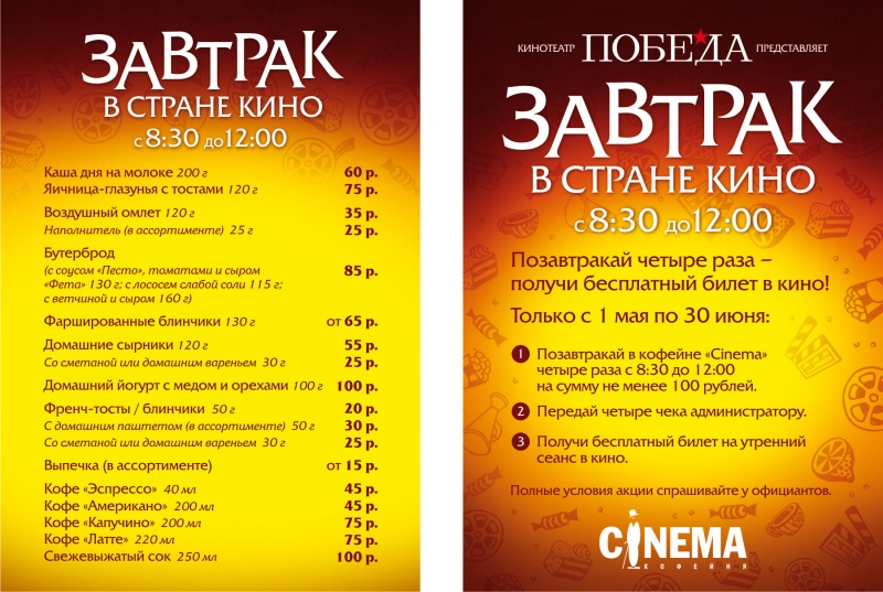 Внесу свои 5 копеек: в кофейне "Синема" действует новое меню завтраков по очень приятным ценам. Завтраки у нас готовятся по будням с 8:30 до 12:00, добро пожаловать!