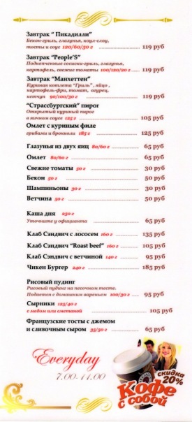 Вообще похоже, что только в Пиплс по выходным можно позавтракать, и только у них с 7 часов (или даже с 5 по выходным) и аж до 13-00. Остальные с 8 или с 9 и до 12. В Кофемолке вроде скидки на завтрак до 11 часов.