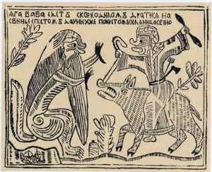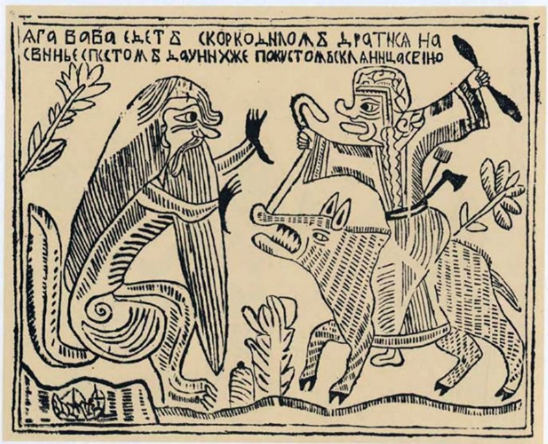 Над второй картинкой тоже есть надпись (есть описание в Сборнике): "Баба-яга деревянна нога едет скаркарладилом дратися на свинье с пестом стоит вина".