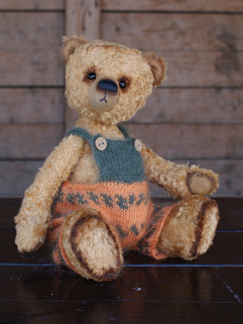 Вискоза, набивка: минеральный гранулят, синтепух, глазки стеклянные, шплинтовое соединение лап. Комбезик для мишки связан мной на спицах.