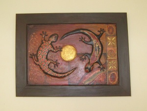 Картина с объемной ящерицей. В широкой деревянной раме, рама искусственно состарена под черное дерево с позолотой