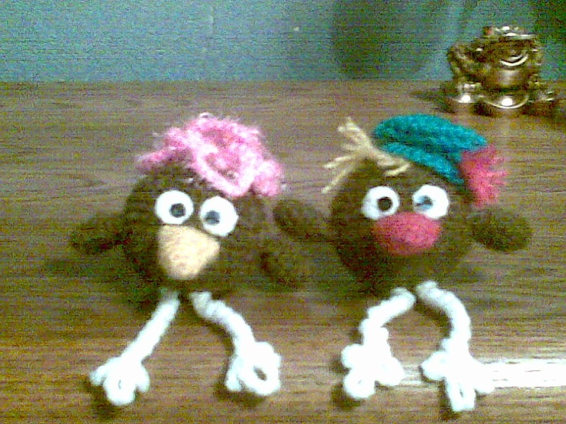 Второе - мое, вязала из б/у ниток,торопилась, вышло корявенько и брутально, сейчас сходила за ниточками, свяжу еще одного:)