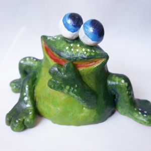 в жабе килограмм самотвердевающей пластики... а размером она где-то 15-17 см высотой и размах ног где-то 25 см.... вполне "огородного" размера получилась )))